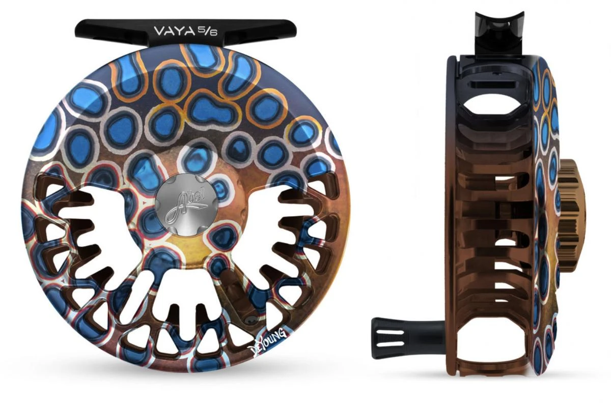 De Abel Vaya DeYoung Cutthroat Flank #5/6 Reel is een vliegenreel voor de lijnklassen #5 en 6, voor het allround vliegvissen op forel, die uitgevoerd is met een schitterende schildering van de flank van een cutthroat forel van kunstenaar Derek DeYoung plus zijn handtekening op het frame van de reel.