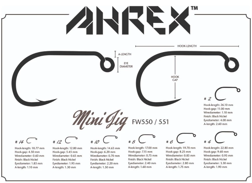 De Ahrex FW550 Mini Jig is de perfecte haak voor de moderne methoden van nimfvissen – in de verschillende Europese stijlen – bij het vissen met mini-jigs.