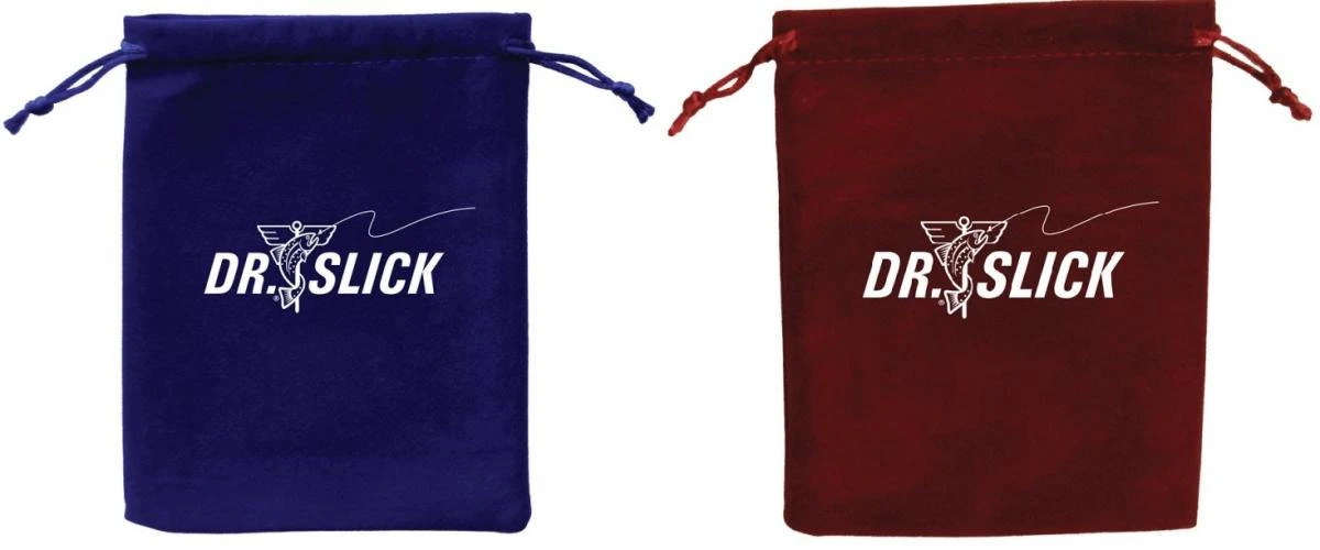 Velvet drawstring knick knack bags with Dr. Slick logo.