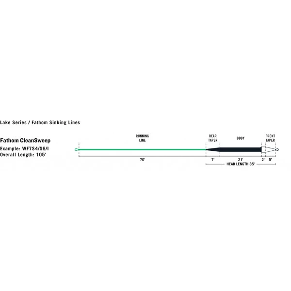 De CleanSweep vliegenlijnen van RIO Products, zoals de RIO Products Premier Fathom CleanSweep Sinking Fly Line in Clear/Black/Dark Aqua, zijn een serie zinkende vliegenlijnen die vervaardigd zijn met een transparante, intermediate punt, deze is naadloos bevestigd aan een sneller zinkende buik en vervolgens aan een langzamer zinkende volglijn. Deze mix van zinksnelheden van de RIO Products Premier Fathom CleanSweep Sinking Fly Line resulteert in een ‘dodelijk’ pad van de vlieg door het water, waarbij de lijn door alle waterlagen heen ‘veegt’ – vanaf het wateroppervlak tot op grote diepte en weer terug naar het wateroppervlak – waarmee bij elke worp vele waterlagen afgevist worden. Elke vliegenlijn heeft een korte, snel de hengel ladende buik om het aantal valse worpen te beperken, plus een Hang Marker dat de vliegvisser toont wanneer hij moet stoppen met strippen.