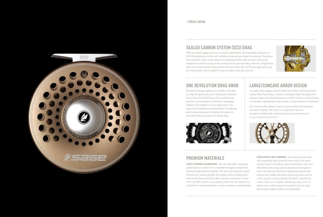 De Sage Spey Fly Reel combineert klassieke esthetiek met moderne prestaties. De Sage Spey Fly Reel introduceert een vliegenreel ontworpen voor de vliegvisser die op zoek is naar een reel die de nuances van het Spey vissen aanpakt. De Sage Spey Fly Reel is zwaarder om langere hengels beter in balans te houden en heeft een grotere capaciteit om dikkere Spey vliegenlijnen te kunnen bevatten. De vliegenreel is voorzien van lijnbeschermers om te voorkomen dat dunne lijnen tussen de spoel en het frame komen tijdens dynamische werpbewegingen. Een romantische aantrekkingskracht met ontwerpen en kleuren die het klassieke gevoel van vroeger weerspiegelen, maar toch vol met prestatiekenmerken die ervoor zorgen dat je nooit die vis van je leven zult verliezen.