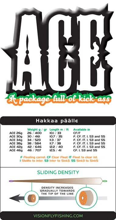 De bekende ACE schietkoplijnen van Vision zijn nu nog beter geworden. Vision keerde terug naar de tekentafel en na drie maanden van goed nadenken kwamen ze terug met een briljante taper. Het ontwerpen van vliegenlijnen is een vak apart. De nieuwe schietkoplijnen hebben alle belangrijke kenmerken zoals super dunne en sterke lussen aan beide uiteinden en prints op de lussen die aangeven welk uiteinde met de volglijn verbonden dient te worden (jawel, de lus aan de kant van de volglijn is uitgevoerd in dezelfde groene kleur als bij de Ace Skagit schietkoplijnen van Vision); ook het gewicht en de eventuele zinksnelheid wordt erop aangegeven. De schietkoplijnen zijn ook geproduceerd op een super-gevoelige kern met nauwelijks rek, zodat je ook de meest voorzichtige aanbeten kunt voelen.